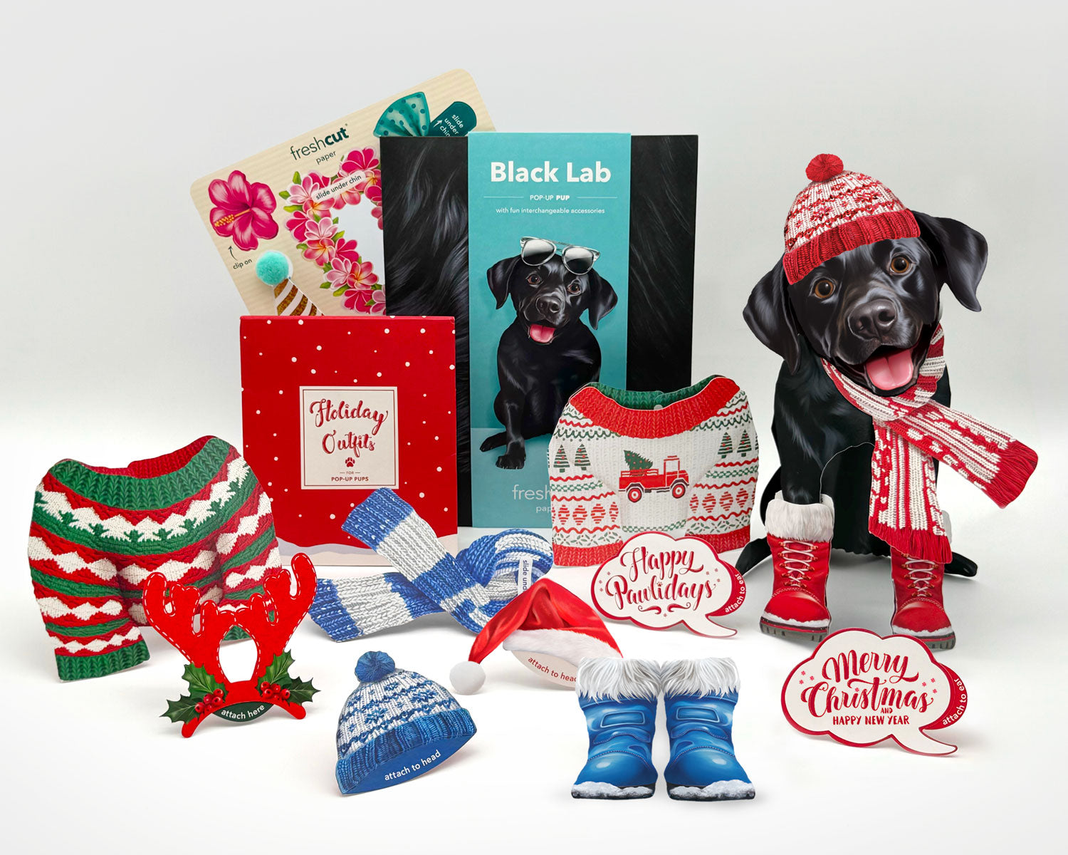 Bring home the holiday cheer with FreshCut Paper’s adorable Pop-Up Black Labrador! Perfect for making every day a little more merry, this charming pup brightens up offices, dorm rooms, and any cozy corners alike. Decked out with interchangeable, holiday-themed and everyday accessories, this holiday hound is ready to make spirits bright. Each delightful Pop-Up Black Labrador also comes with a matching notecard, a mailing envelope, and a customizable speech bubble, perfect for adding your own holiday wishes.