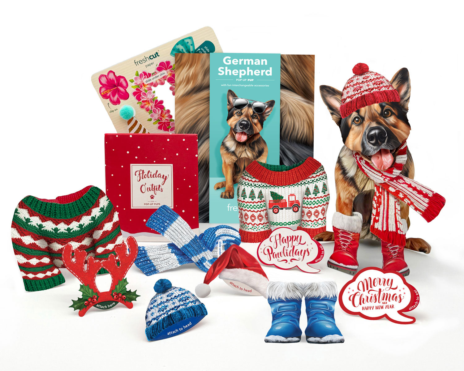 FreshCut Paper’s Pop-Up German Shepherd is the ultimate holiday gift that will make hearts pawsitively glow! This adorable pup arrives ready to spread cheer and goodwill, complete with a beautifully decorated mailing envelope and a matching notecard that’s sure to fetch smiles. Dressed to impress for the holiday paw-ty season, it features interchangeable holiday and everyday accessories and a customizable speech bubble for sending your merry wishes. The paw-fect companion for anyone in need of a little extra love and a loyal friend this holiday season.