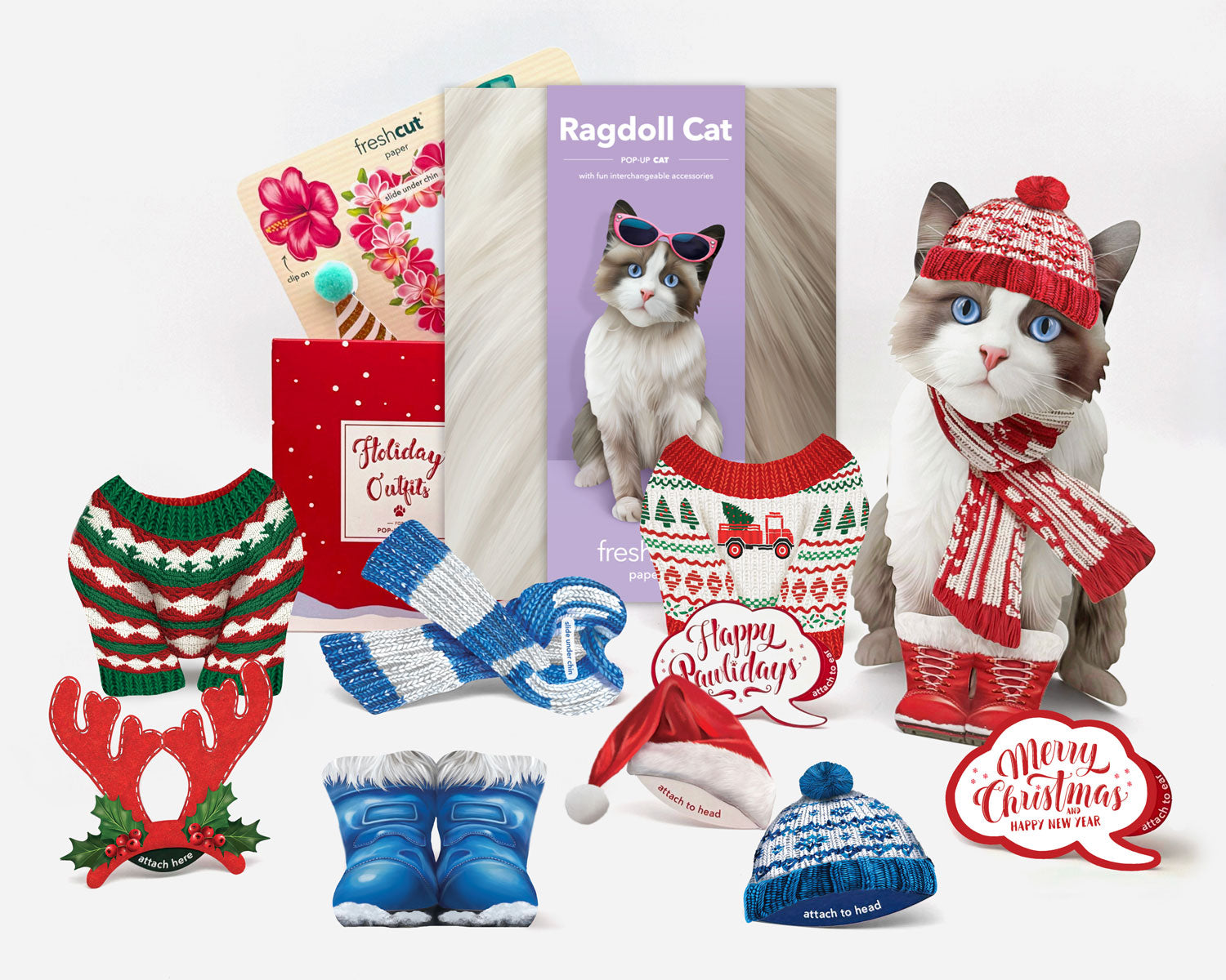 Celebrate the holiday season's most purr-fect moments—or just send a little laughter and joy—with a Holiday Pop-Up Ragdoll Cat. Known for their gorgeous coats and sweet faces, this Ragdoll is an allergy-free way to enjoy all the cuteness of a real kitty (no litter box required!). Each pop-up cat includes a matching notecard, a mailing envelope, interchangeable accessories, and a special holiday accessory pack. Personalize your holiday greetings with a customizable speech bubble, and let this festive Ragdoll spread pawsitive cheer and Christmas magic all season long!