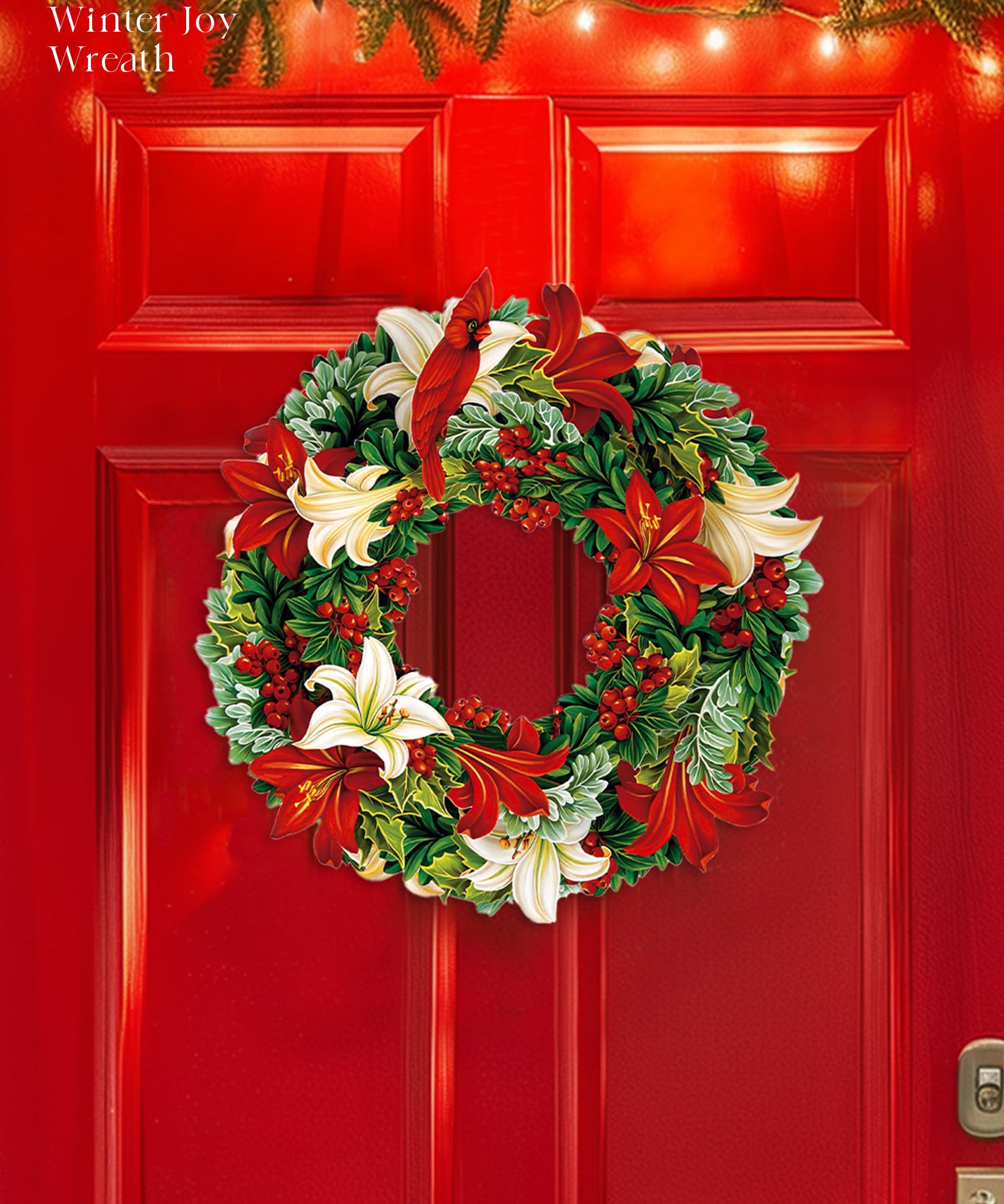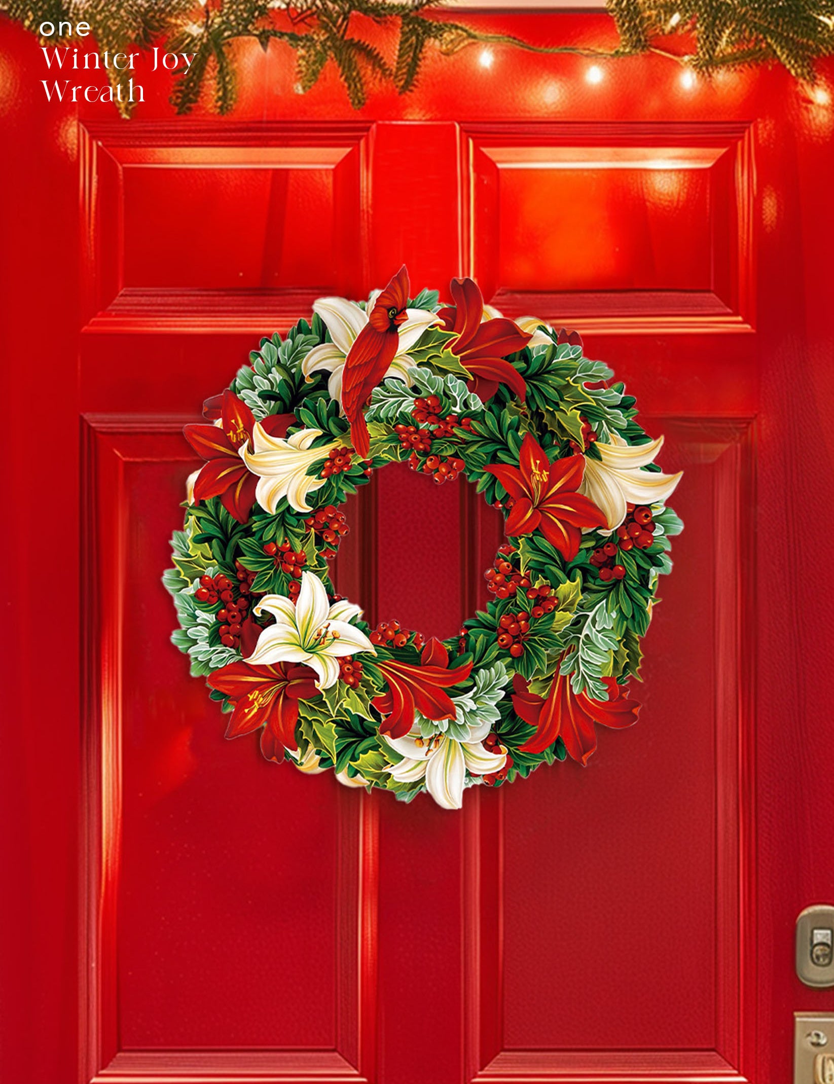 A foldable wreath of red amaryllis, white lilies, boxwood, and holly–easy storage for reuse year after year!